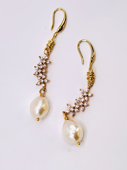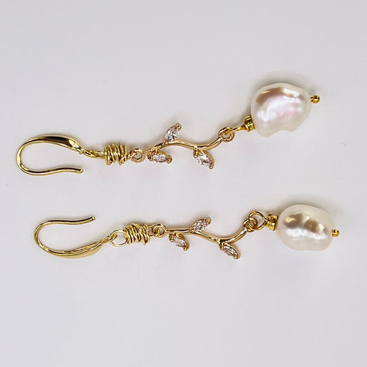 Gold-Filled Baroque Pearl Earrings with Zirconia Leaf Links
