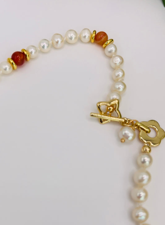 Gold Filled Necklace Pearls and Red Carnelian
