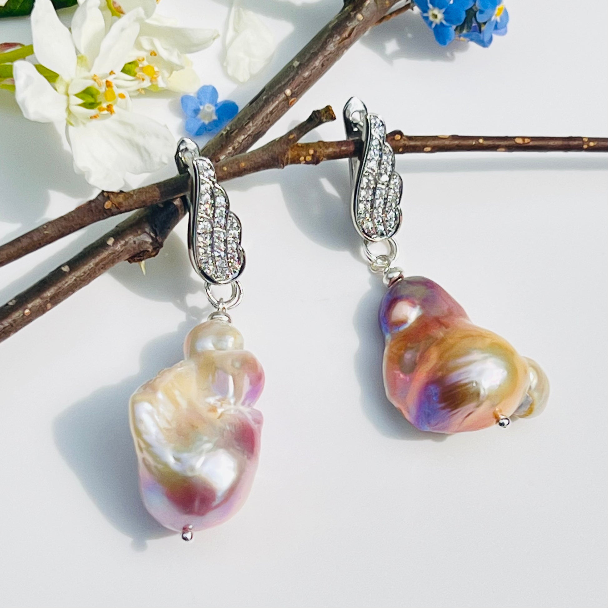 Elevate your style with these stunning earrings featuring natural Fireball Baroque Pearls, each one uniquely shaped and rich with iridescent hues.