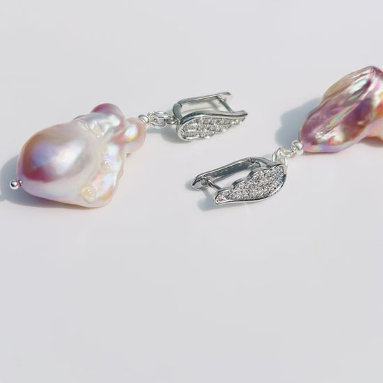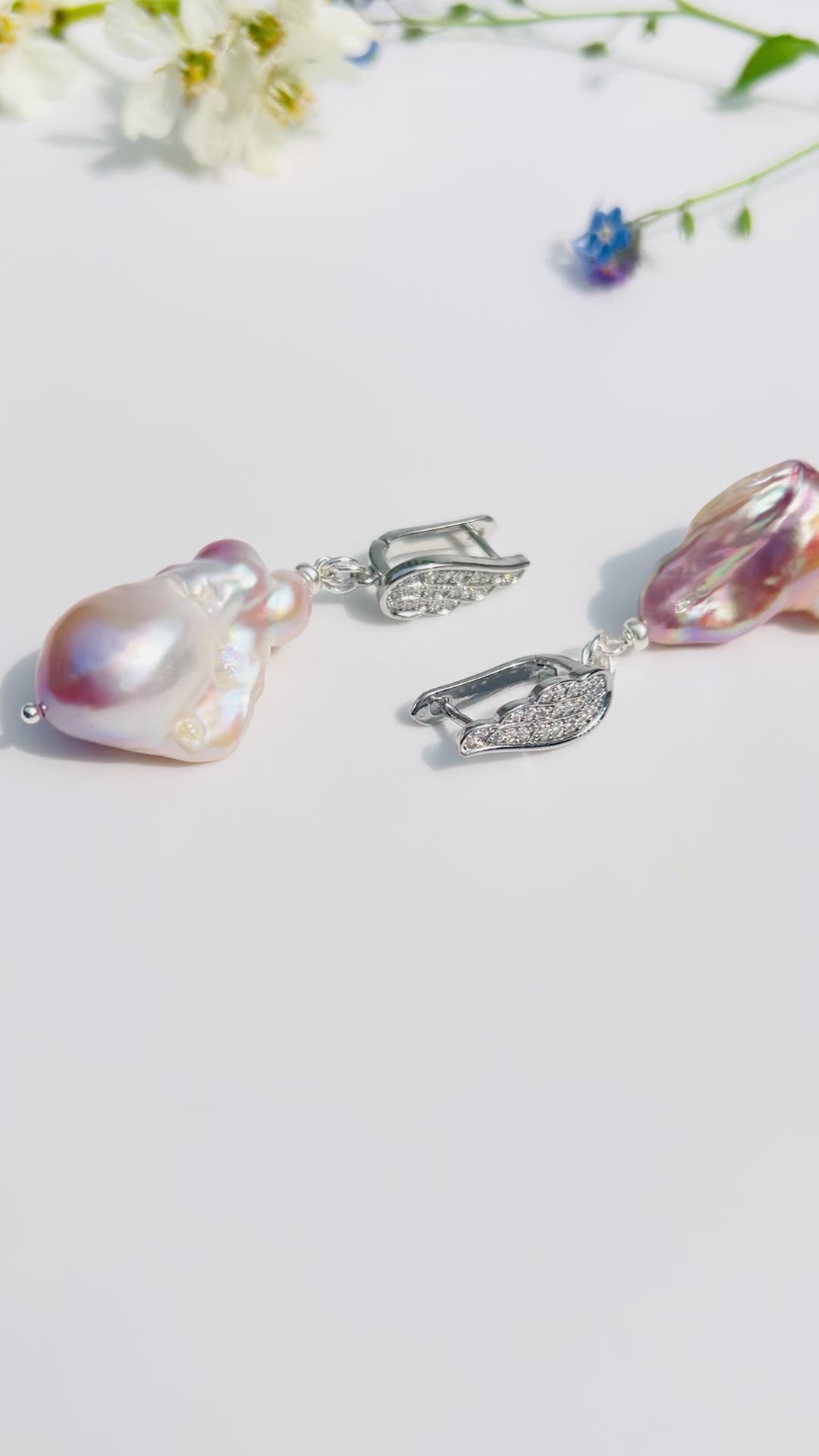from soft pinks and lavenders to golden peach tones. These organic pearls are elegantly set in 925 Sterling Silver, adorned with sparkling cubic zirconia in a delicate wing-like design.