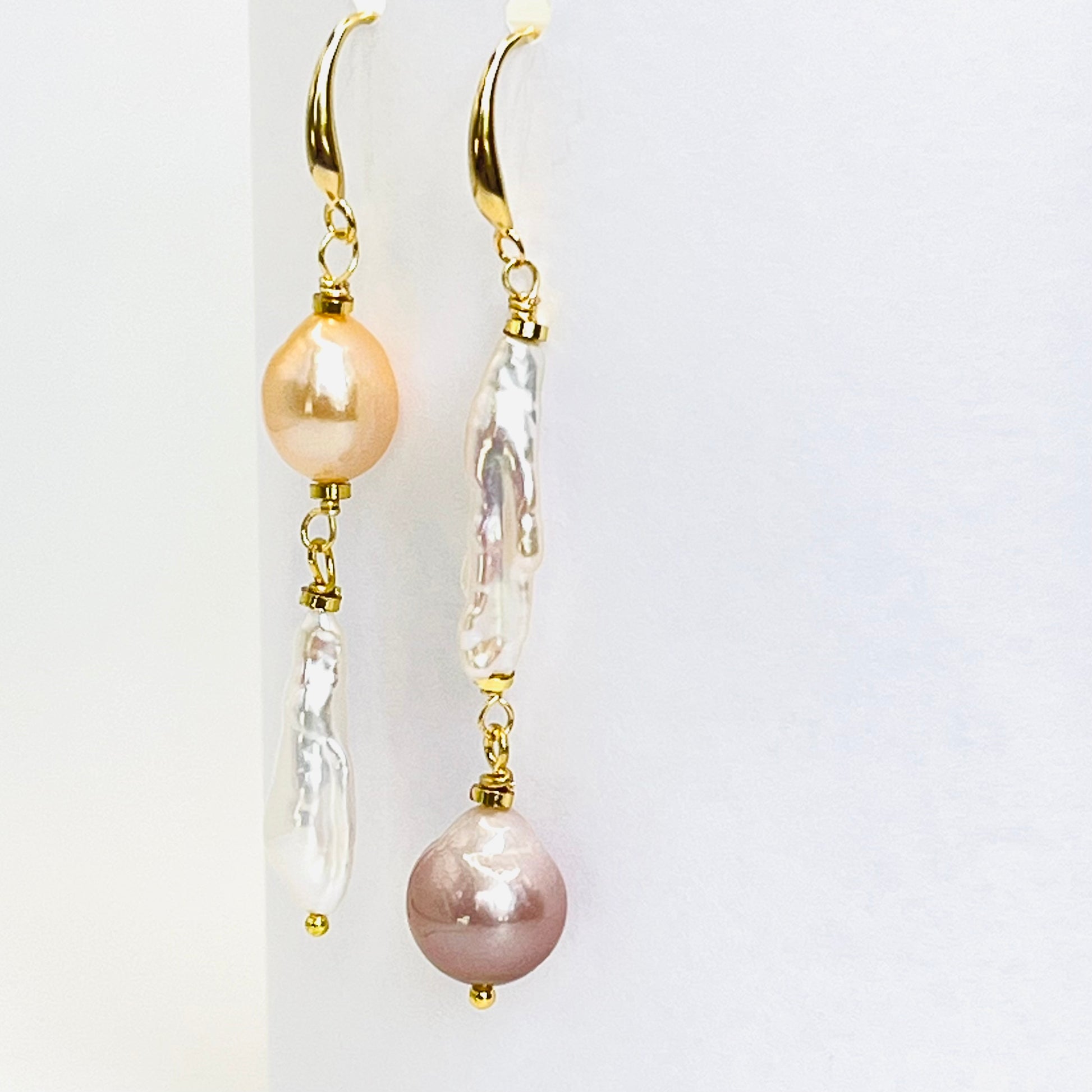 Elevate your style with these exquisite gold-filled earrings, featuring a refined pairing of 12mm Edison pearls and Biwa pearls — both known for their exceptional lustre and timeless charm.