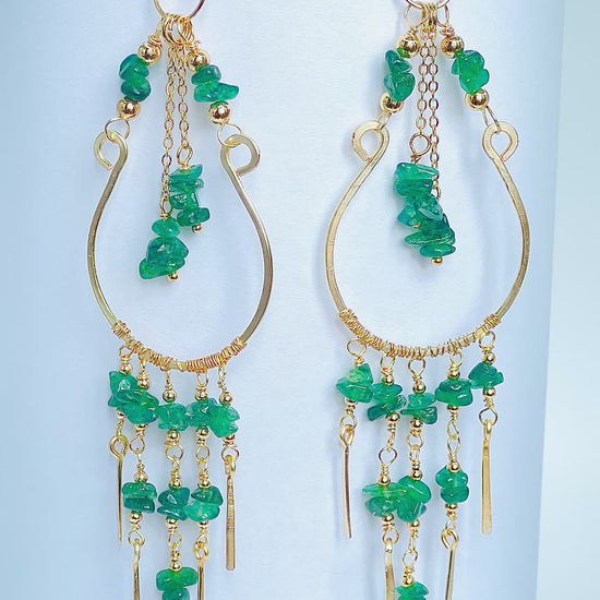 Step into elegance with this one-of-a-kind pair of handcrafted chandelier earrings — made with raw emerald chips and wrapped in 14k gold-filled luxury.